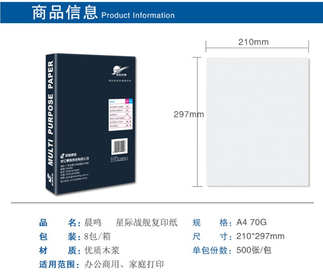 晨鸣/chenming 战神 A4 70g 复印纸 500张/包 8包/箱